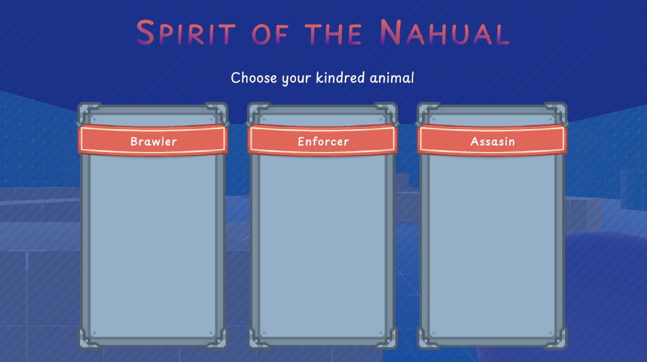 Unknowingly to them, nahuals possess magic linked to their kindred animals. Nahuals can be Enforcers (crocodiles), Assassins (foxes) or Brawlers (bulls). Enforcers are faster when walking and cast a short-ranged arc blast; Assasins are faster when crouching and use a high-precision magic projectile, while Brawlers use their brute force fists and run faster.